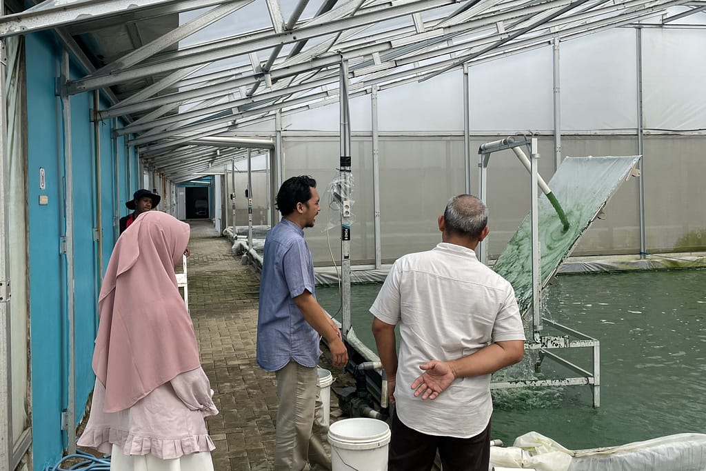 Kegiatan dilanjutkan dengan kunjungan ke greenhouse Albitec, yang menjadi highlight utama kursus ini. Peserta melihat langsung kolam budidaya spirulina sistem terbuka. Penjelasan mendalam diberikan tentang pengendalian kualitas air, pengelolaan kultur steril, hingga monitoring parameter lingkungan untuk menjaga pertumbuhan optimal.