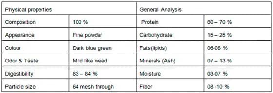 Spirulina mengandung sekitar 60–70% protein, dilengkapi dengan asam fenolat, tokoferol, karoten, dan asam linolenat yang penting dalam nutrisi harian. Sekitar 47% dari total berat proteinnya terdiri dari asam amino esensial, yang menunjukkan bahwa nilai biologis protein Spirulina sangat tinggi dan bermanfaat secara maksimal bagi organisme budidaya.